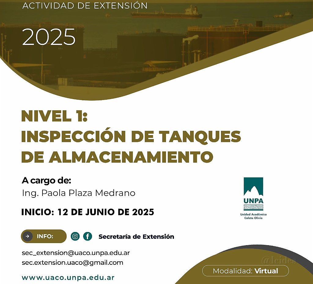 Finalmente, se indicó que quienes deseen conocer más información sobre aranceles y contenido, podrán ingresar en: https://www.uaco.unpa.edu.ar/Actividad/nivel-1-inspeccion-de-tanques-de-almacenamiento