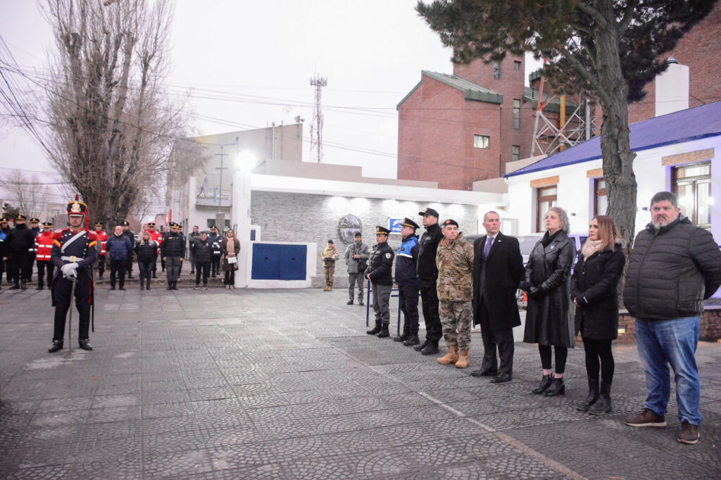 El acto comenzó con la formación “18 de Agosto”, presentada por el Departamento de Escuela de Policía comisario inspector Eduardo Victoriano Taret. La ceremonia incluyó el saludo de estilo al jefe de Gabinete, el izamiento del pabellón nacional a cargo de los Veteranos de Guerra de Malvinas Ramón Quevedo y José Ruiz, y la entonación del Himno Nacional.