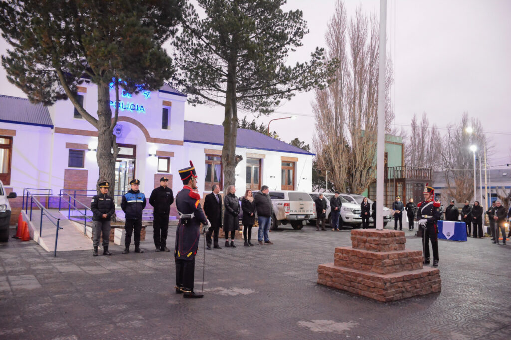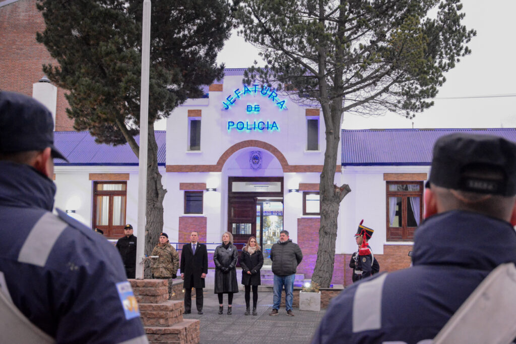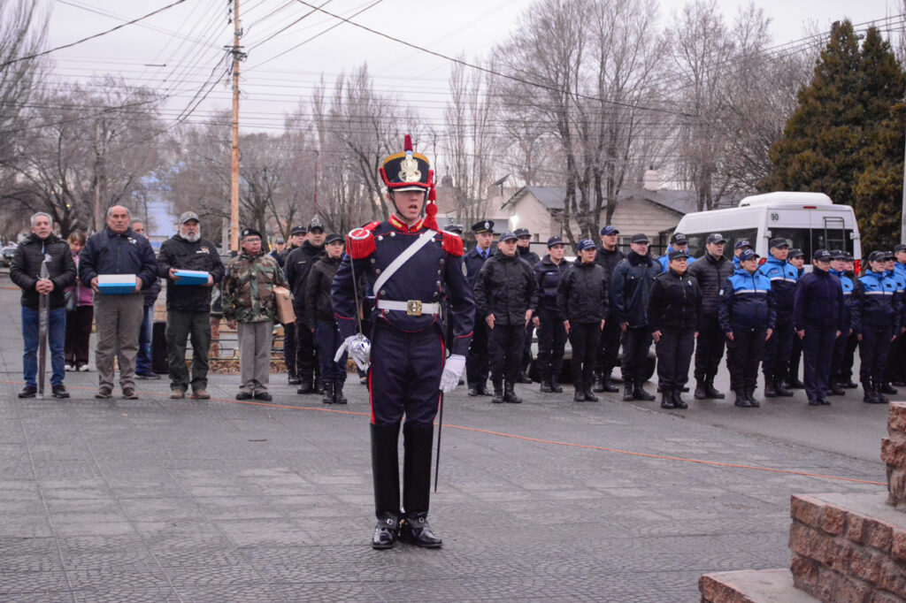 El acto comenzó con la formación “18 de Agosto”, presentada por el Departamento de Escuela de Policía comisario inspector Eduardo Victoriano Taret. La ceremonia incluyó el saludo de estilo al jefe de Gabinete, el izamiento del pabellón nacional a cargo de los Veteranos de Guerra de Malvinas Ramón Quevedo y José Ruiz, y la entonación del Himno Nacional.