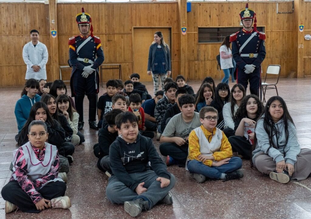 En este marco, los Granaderos a Caballo del Regimiento “General San Martín” -institución creada por el propio Libertador en 1812 y símbolo vivo de la identidad nacional- visitaron distintas instituciones educativas de Río Gallegos. Allí, el sargento Germán Fernández y el soldado voluntario Francisco Piris compartieron con alumnos y docentes relatos históricos, experiencias y vivencias propias de su servicio.