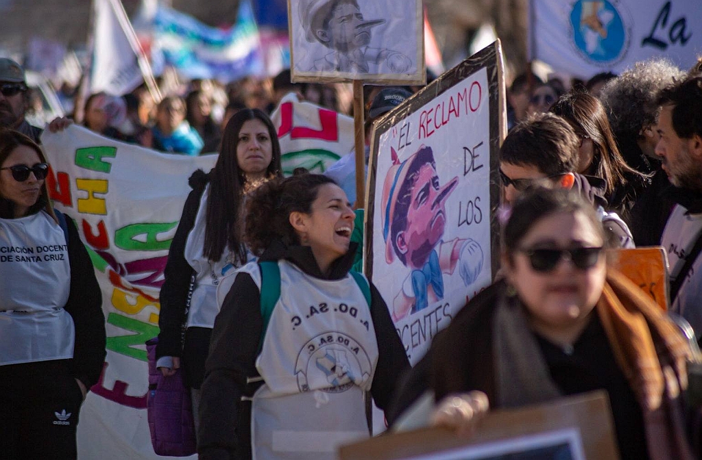 Viernes, 22 Agosto 2025 – Docentes de toda la provincia protagonizaron este jueves una marcha por calles de Río Gallegos, en el marco de un paro de 72 horas. La protesta finalizó con un acto frente a la Casa de Gobierno.