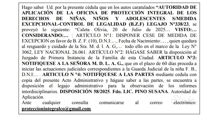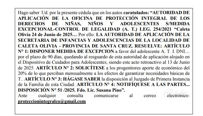 EXCEPCIONAL-CONTROL DE LEGALIDAD (A. T.) LEG. 254/2021 “Caleta Olivia 24 de Junio de 2025… Por ello: LA AUTORIDAD DE APLICACIÓN DE LA SECRETARIA DE INFANCIAS Y ADOLESCENCIAS DE LA LOCALIDAD DE CALETA OLIVIA – PROVINCIA DE SANTA CRUZ. RESUELVE: ARTÍCULO N° 1: DISPONER MEDIDA DE EXCEPCION a favor del adolescente A. T. I. DNI… por el plazo de 90 días, quedando al resguardo de esta autoridad de aplicación alojado en el Dispositivo de Cuidados para Adolescentes, siendo este acto retroactivo al 13 de Junio de 2025. ARTÍCULO N° 2: SOLICÍTESE a los progenitores aporte de económico del 20% de lo que perciban mensualmente a los efectos de garantizar necesidades básicas de T.. ARTÍCULO N° 3: HÁGASE SABER la disposición al Juzgado de Primera Instancia de la Familia de esta Ciudad. ARTÍCULO N° 4: NOTIFÍQUESE A LAS PARTES… DISPOSICIÓN N° 51 /2025. Fdo. Lic. Susana Pino”. Ante cualquier consulta comunicarse al correo electrónico: [email protected]