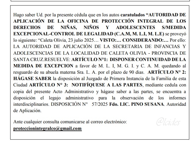 Hago saber Ud. por la presente cédula que en los autos caratulados “AUTORIDAD DE APLICACIÓN DE LA OFICINA DE PROTECCIÓN INTEGRAL DE LOS DERECHOS DE NIÑAS, NIÑOS Y ADOLESCENTES S/MEDIDA EXCEPCIONAL-CONTROL DE LEGALIDAD (C.A.M, M. L.I, M. L.E) se proveyó lo siguiente: “Caleta Olivia, 23 julio 2025… VISTO:… CONSIDERANDO:… Por ello: LA AUTORIDAD DE APLICACIÓN DE LA SECRETARIA DE INFANCIAS Y ADOLESCENCIAS DE LA LOCALIDAD DE CALETA OLIVIA – PROVINCIA DE SANTA CRUZ.RESUELVE: ARTÍCULO N°1: DISPONER CONTINUIDAD DE LA MEDIDA DE EXCEPCION a favor de M. L. I, M. G. I. y C. A. M. quedando al resguardo de su abuela materna Sra. L. A. por el plazo de 90 dias. ARTÍCULO N° 2: HÁGASE SABER la disposición al Juzgado de Primera Instancia de la Familia de esta Ciudad ARTÍCULO N° 3: NOTIFÍQUESE A LAS PARTES, mediante cedula con copia del presente Acto Administrativo y hágase saber a las partes, se encuentra a disposición el legajo administrativo para la observación de los informes interdisciplinarios. DISPOSICIÓN N° 57/2025 Fdo. LIC. PINO SUSANA. Autoridad de Aplicación.