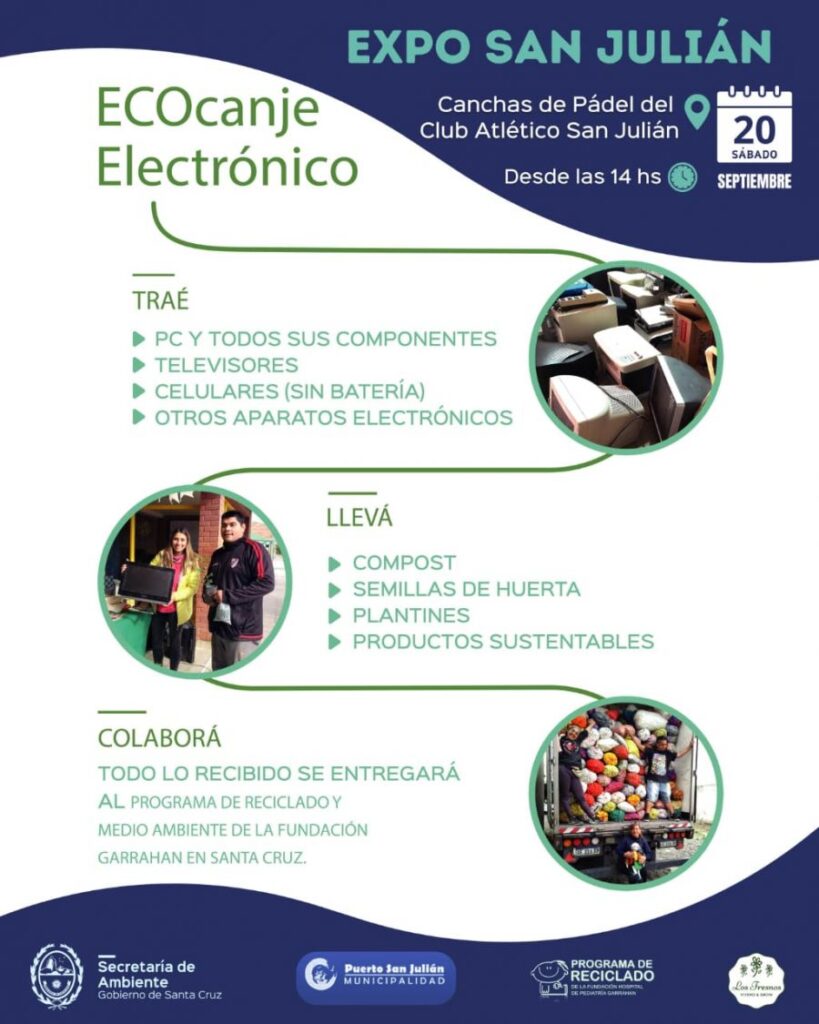 Se llevará a cabo un Eco-canje electrónico, que es una iniciativa que se desarrolla la provincia para el tratamiento de residuos de aparatos eléctricos y electrónicos (RAEE), donde los ciudadanos pueden canjear su chatarra electrónica por compost, semillas, plantines de estación y otros elementos sustentables. Además, estará invitando a la población que tengan residuos electrónicos fuera de uso, a que los lleve ese día.