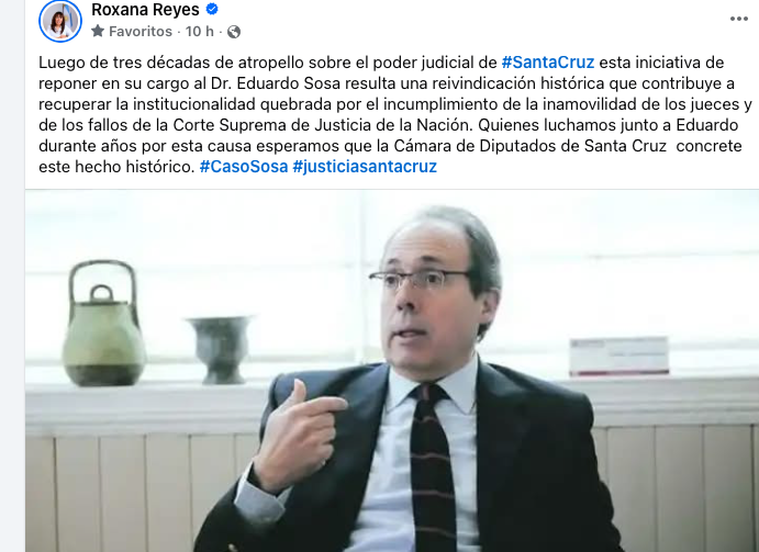 “Luego de tres décadas de atropello sobre el Poder Judicial de Santa Cruz, esta iniciativa de reponer en su cargo al Dr. Eduardo Sosa resulta una reivindicación histórica que contribuye a recuperar la institucionalidad quebrada por el incumplimiento de la inamovilidad de los jueces y de los fallos de la Corte Suprema”, sostuvo Roxana Reyes.