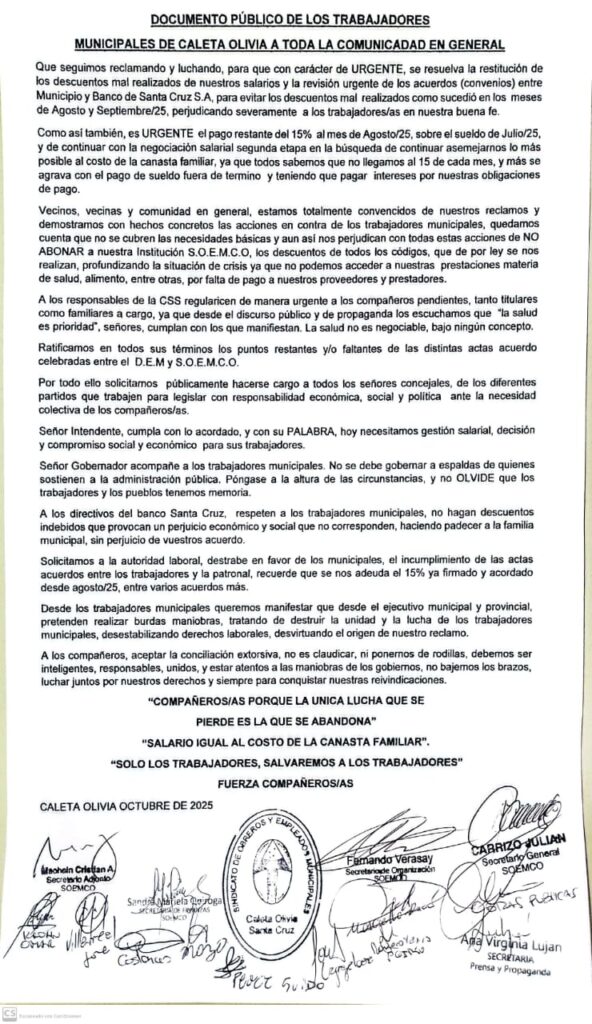 El Sindicato de Obreros y Empleados Municipales (SOEM) de Caleta Olivia emitió un fuerte comunicado público dirigido a la comunidad en general, donde reclamó la restitución inmediata de los descuentos mal aplicados en los sueldos de los trabajadores durante los meses de agosto y septiembre de 2025.