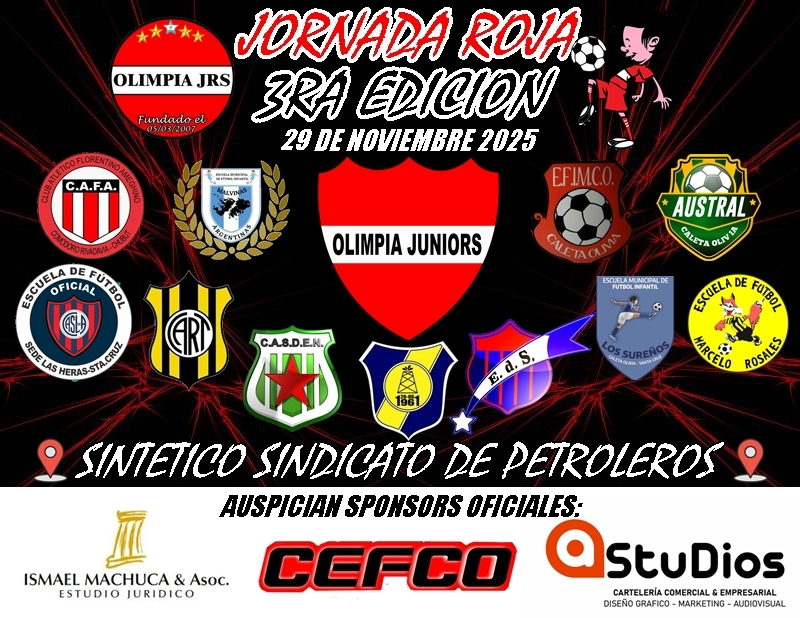 Como lo viene haciendo hace varios años se viene una Nueva «Jornada Roja» en esta ocasión es la 3° Edición de la misma la cual contará con varios Clubes y Escuelitas, en esta ocasión será con Equipos de las localidades de Las Heras, Rada Tilly y Comodoro Rivadavia, sumado a Escuelitas de Caleta Olivia.