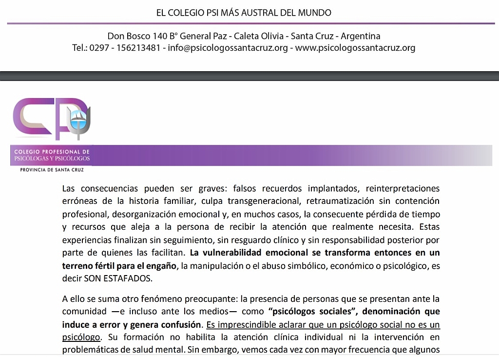 El Colegio Profesional de Psicólogas y Psicólogos de la Provincia de Santa Cruz se dirige a los medios de comunicación de nuestra provincia para expresar con firmeza una preocupación que involucra directamente el bienestar y la seguridad emocional de nuestra comunidad. Nos mueve la responsabilidad institucional que nos confiere la Ley y, sobre todo, la obligación de advertir sobre prácticas que, aunque se presenten con lenguaje amable, espiritual o transformador, representan un riesgo concreto para la salud mental de la población.