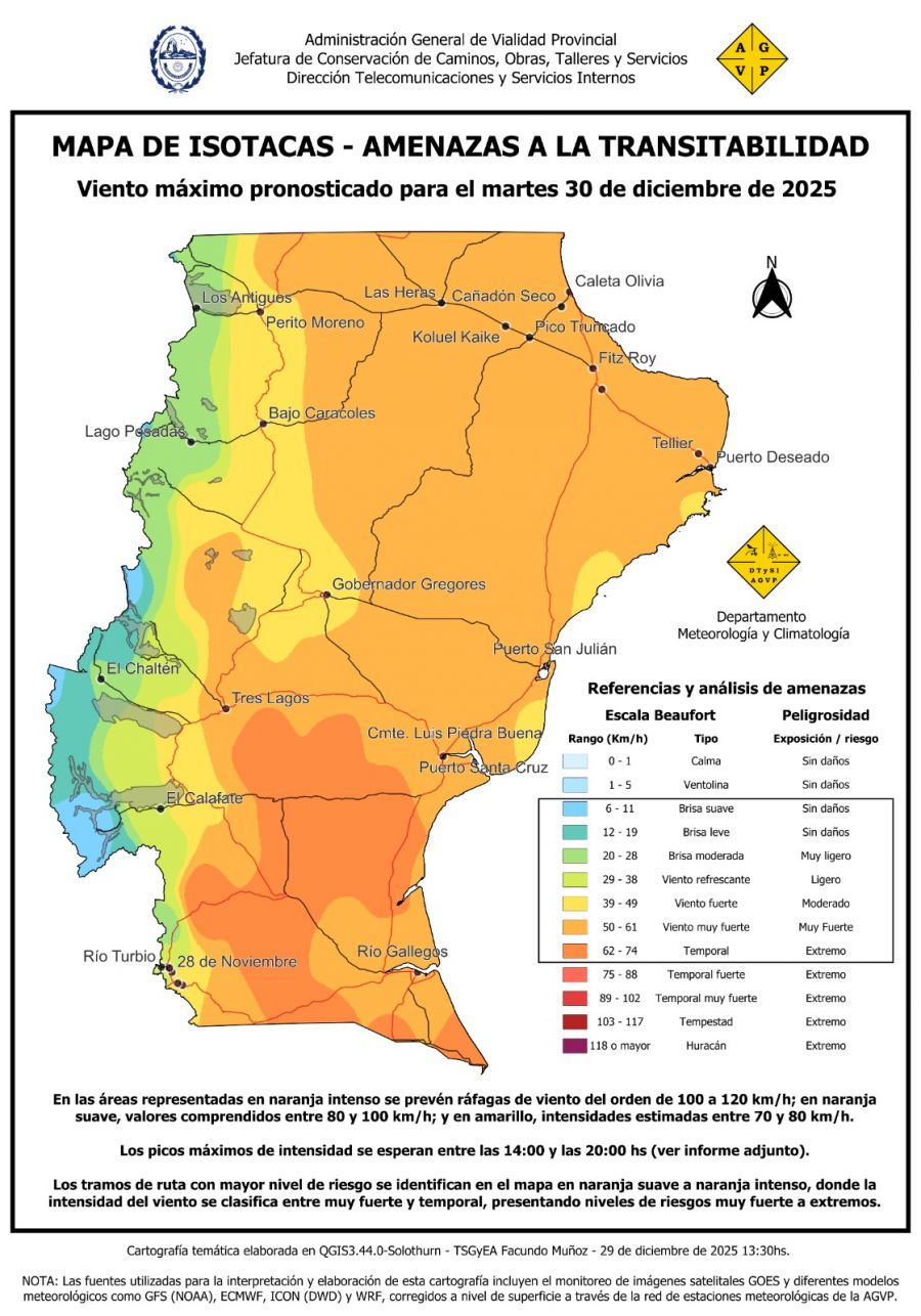 Lunes, 29 Diciembre 2025 – El Departamento de Meteorología y Climatología de la Administración General de Vialidad Provincial (AGVP) informa que, durante la jornada del martes 30 de diciembre de 2025, se prevé un escenario meteorológico caracterizado por vientos intensos, que afectará a gran parte del territorio provincial y podría generar afectaciones sobre la transitabilidad.