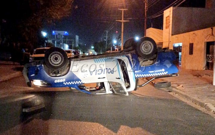 Choque de patrulleros, uno quedo volcado en el centro de Caleta Olivia
