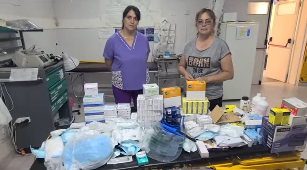 Entre los elementos donados se encuentran medicamentos, gasas, jeringas, barbijos, guantes descartables, guantes quirúrgicos y agua oxigenada, insumos fundamentales para la atención médica en un contexto de emergencia sanitaria y ambiental.