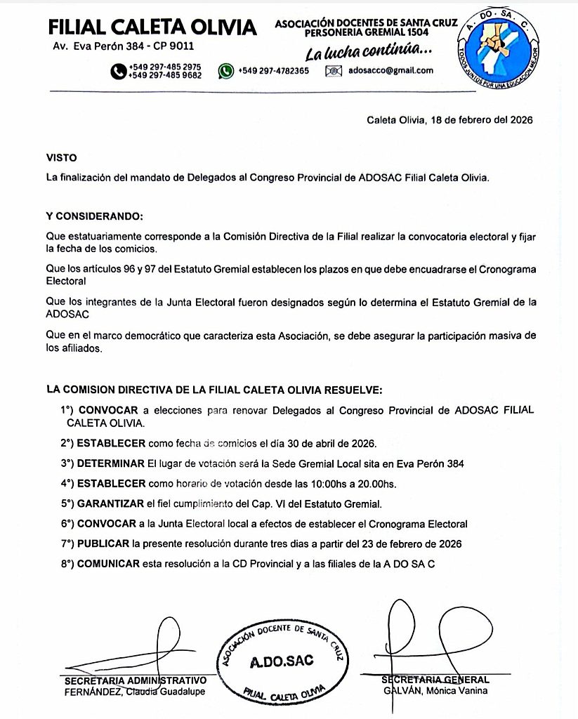 Adosac Caleta Olivia realiza convocatoria electoral y fija la fecha de los comicios