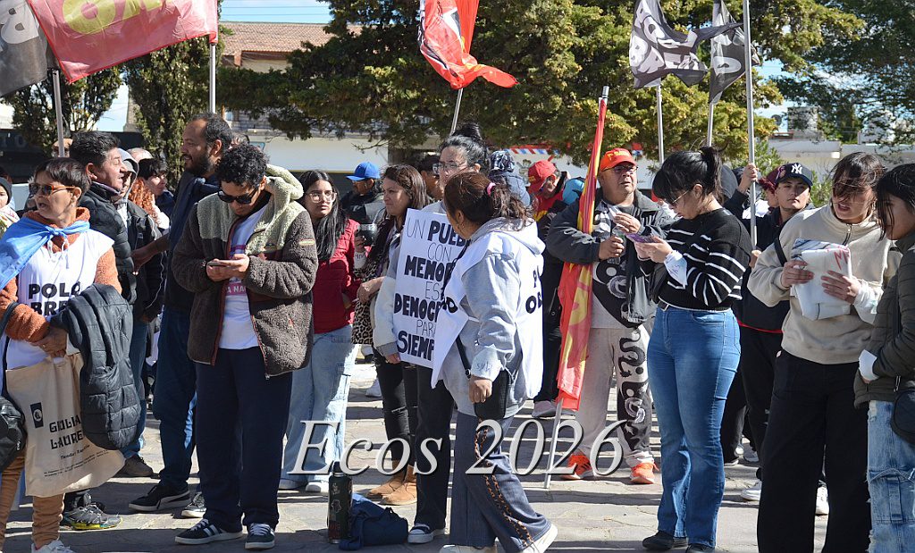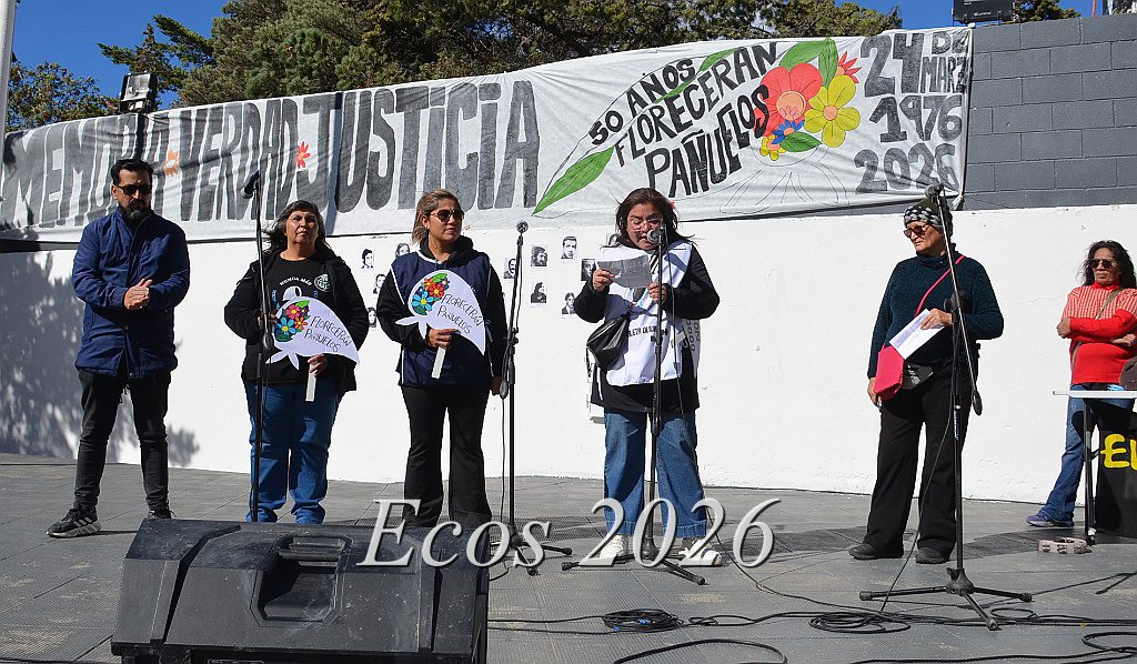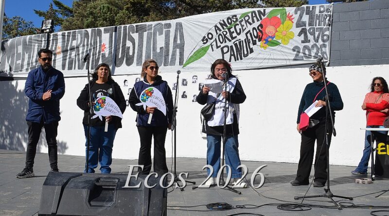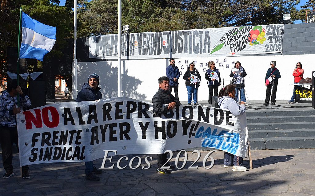 Miércoles, 25 Marzo 2026 –El Frente Sindical y organizaciones sociales de Caleta Olivia eligieron la Plaza 20 de Noviembre para conmemorar en la tarde de este ventoso martes el Día de la Memoria, Verdad y Justicia.