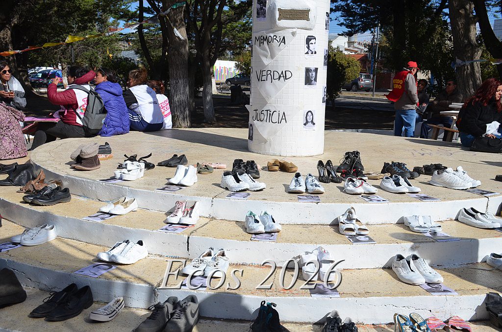 Además, vociferaron cánticos contra los represores y el actual gobierno nacional, agitaron pañuelos blancos y colocaron zapatillas y zapatos que colocaron en pedestal con fotografías que representaban a los desaparecidos en todo el país, nombrando de manera especial a los santacruceños víctimas de la dictadura.
