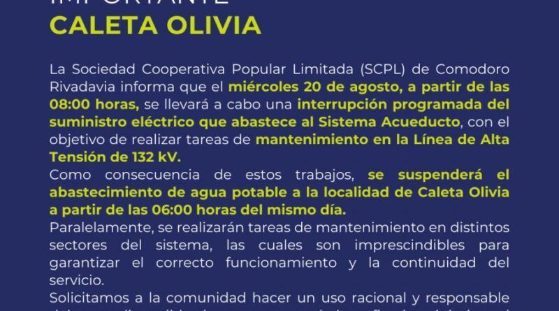 Leer másSábado, 16 Agosto 2025 – Servicios Públicos Sociedad del Estado (SPSE) informa a los vecinos de Caleta Olivia que el